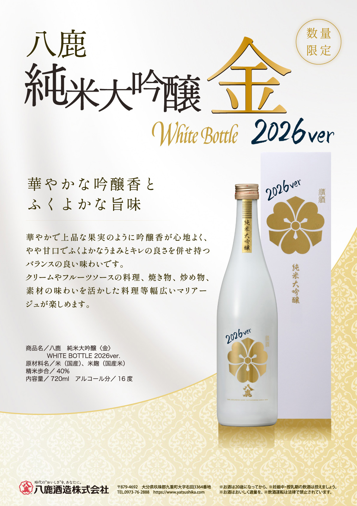 | 製品名: | 八鹿 純米大吟醸(金)WHITE BOTTLE 2026ver. |